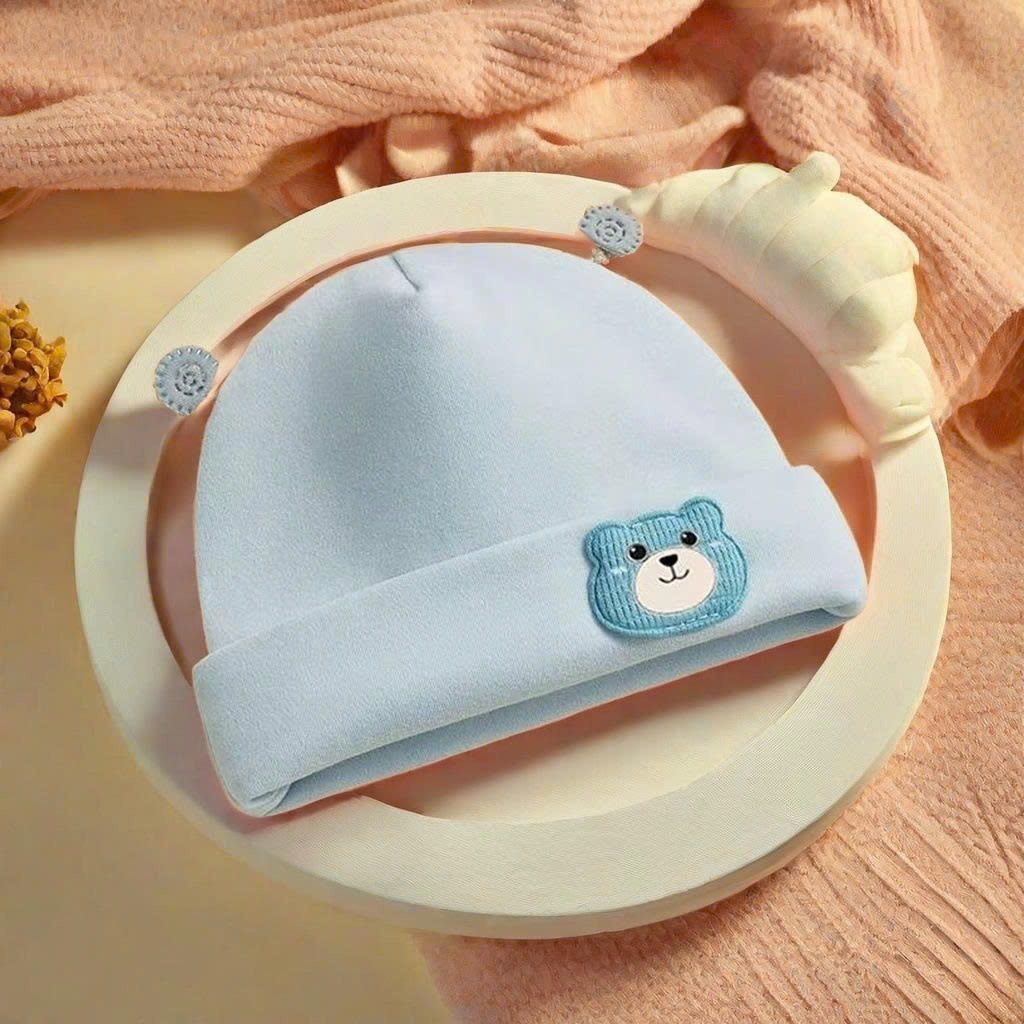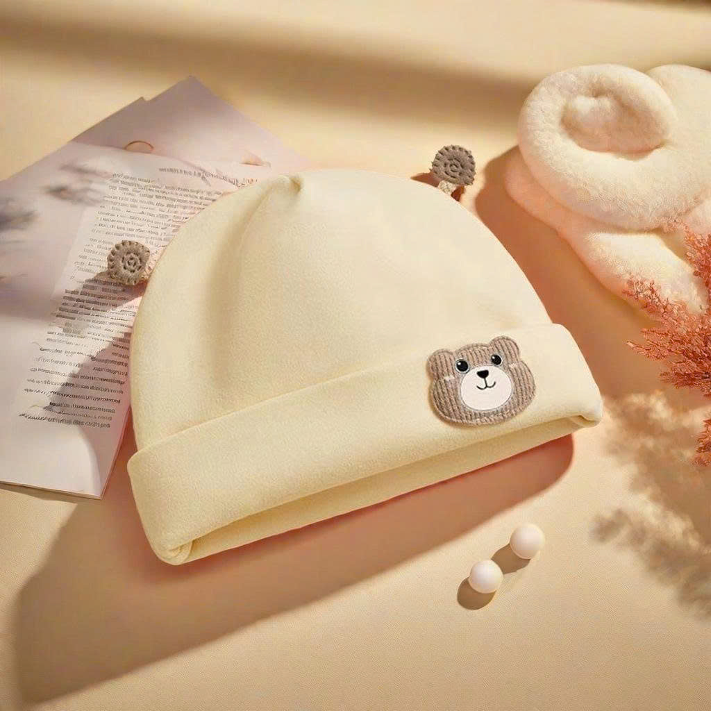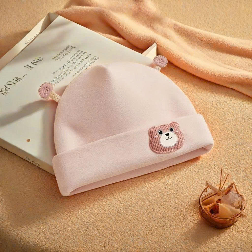 Mũ nỉ cotton 2 lớp tai ốc sên, họa tiết đính gấu dày dặn mềm mịn giữ ấm cho bé từ 0 – 5 tháng