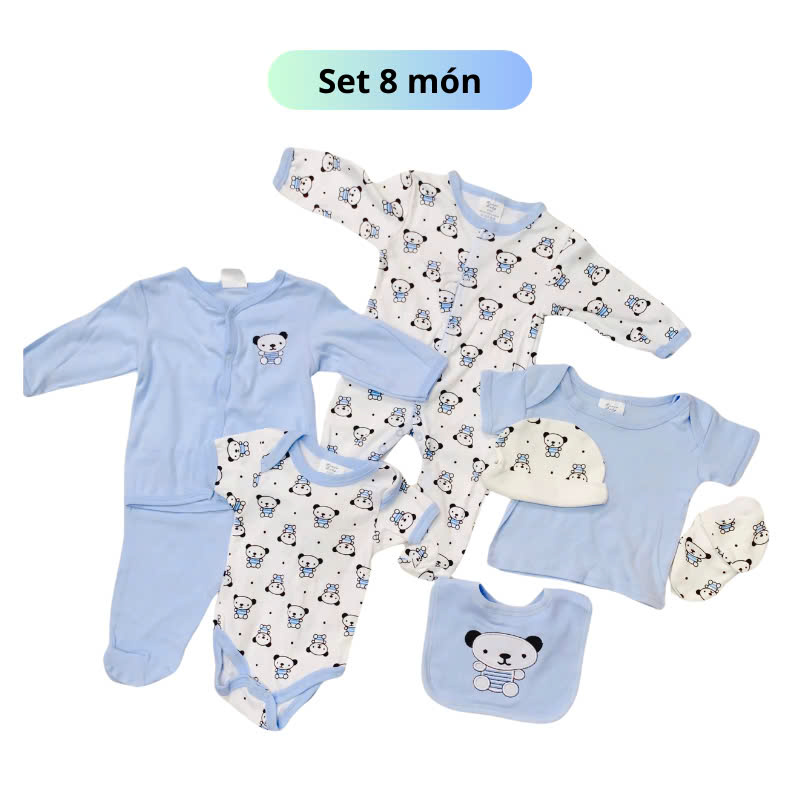 – Set 8 chi tiết bao gồm: 1 yếm, 1 đôi bao tay, 1 mũ, 1 bộ body dài liền tất, 1 bộ body chip, 1 quần rời liền tất, 1 áo cộc rời, 1 áo dài tay rời